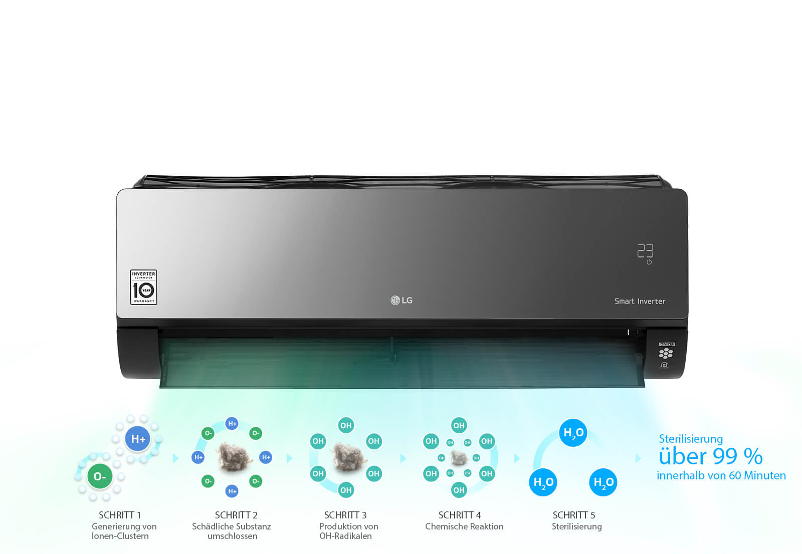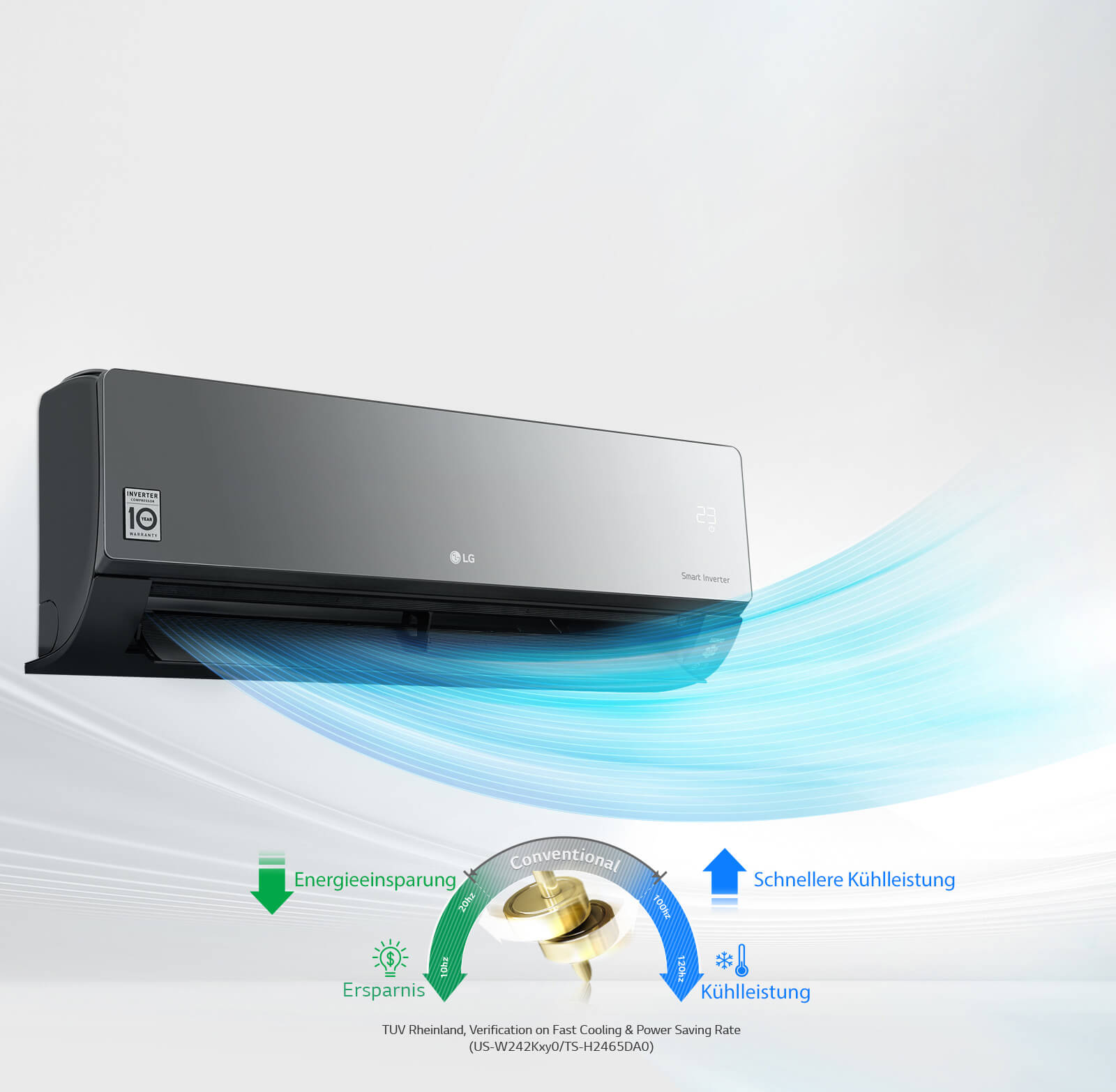 The Inverter Compressor instantly adjusts the speed of the compressor to maintain desired temperatures. In addition. the inverter compressor is equipped with power saving function in the frequency range to save more energy than a conventional compressor. Thanks to the device. the air is distributed further and faster.