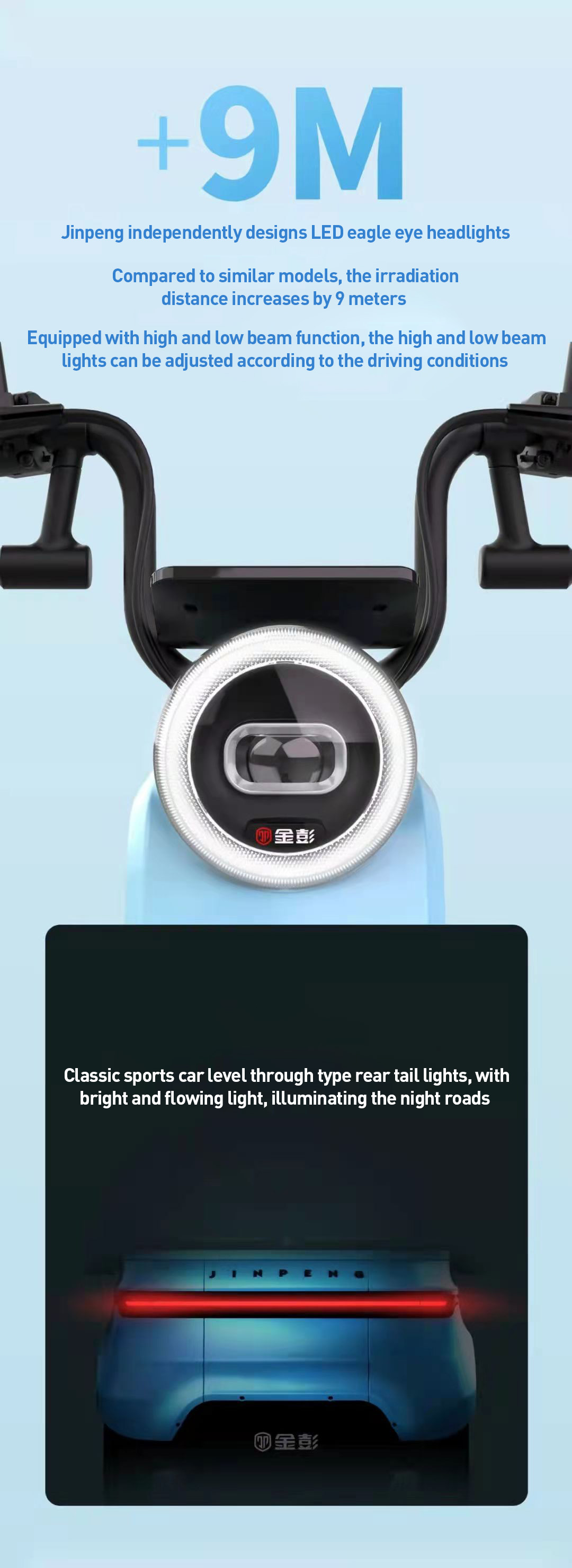 LED Eagle Eye Headlights : The N8 features Jinpeng's proprietary LED eagle eye headlights. which increase the illumination distance by 9 meters compared to similar models. This ensures better visibility and safer night riding.