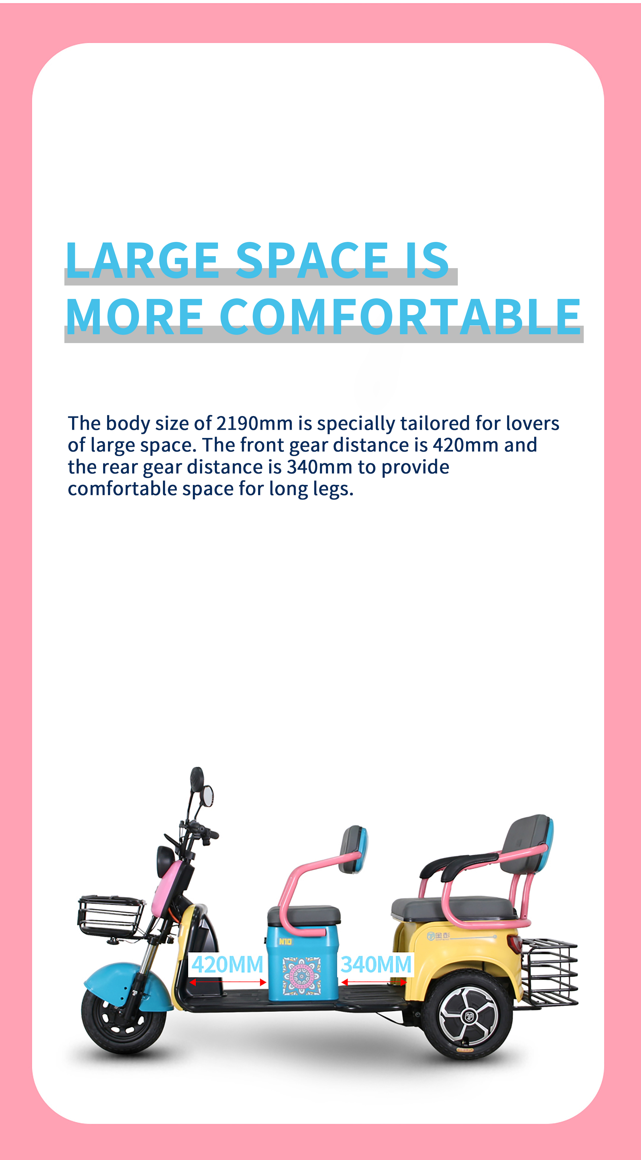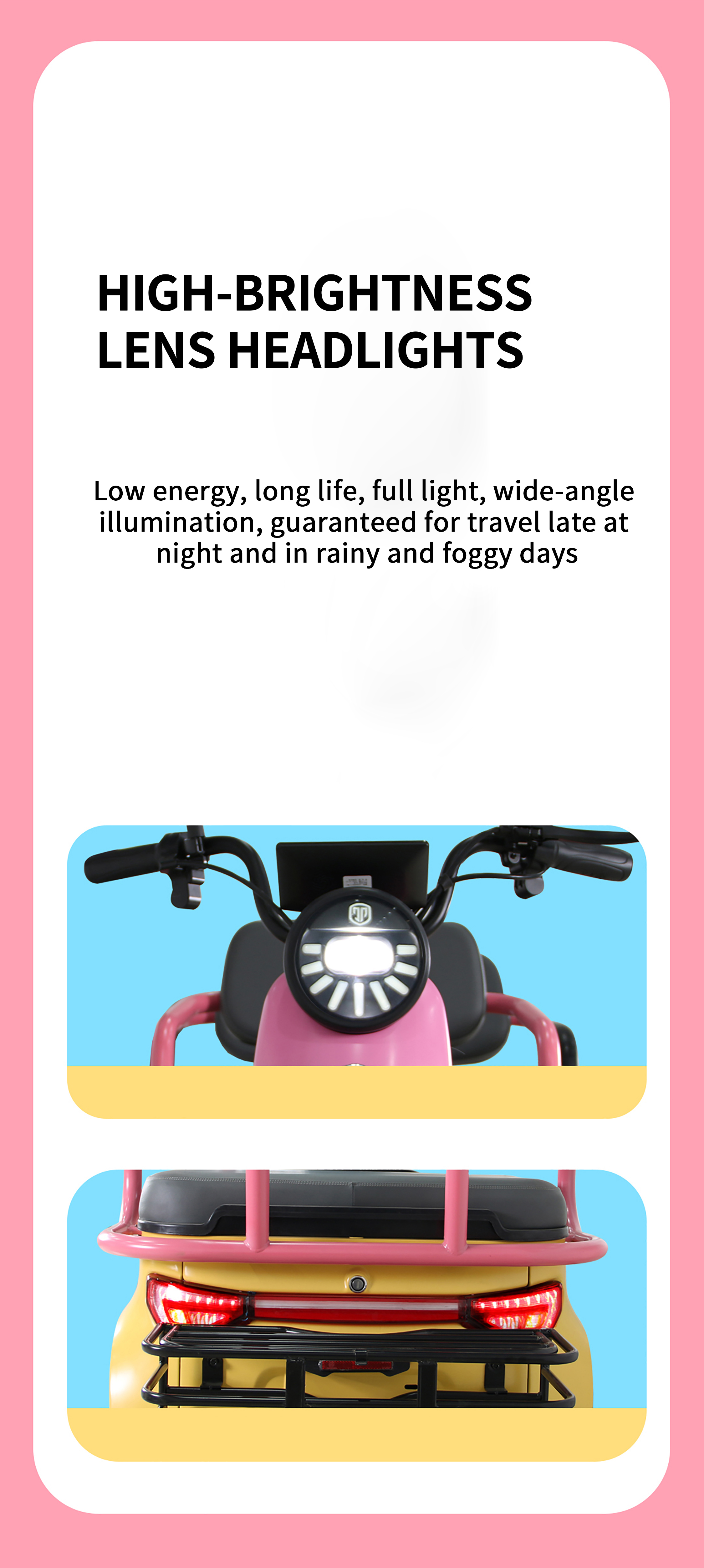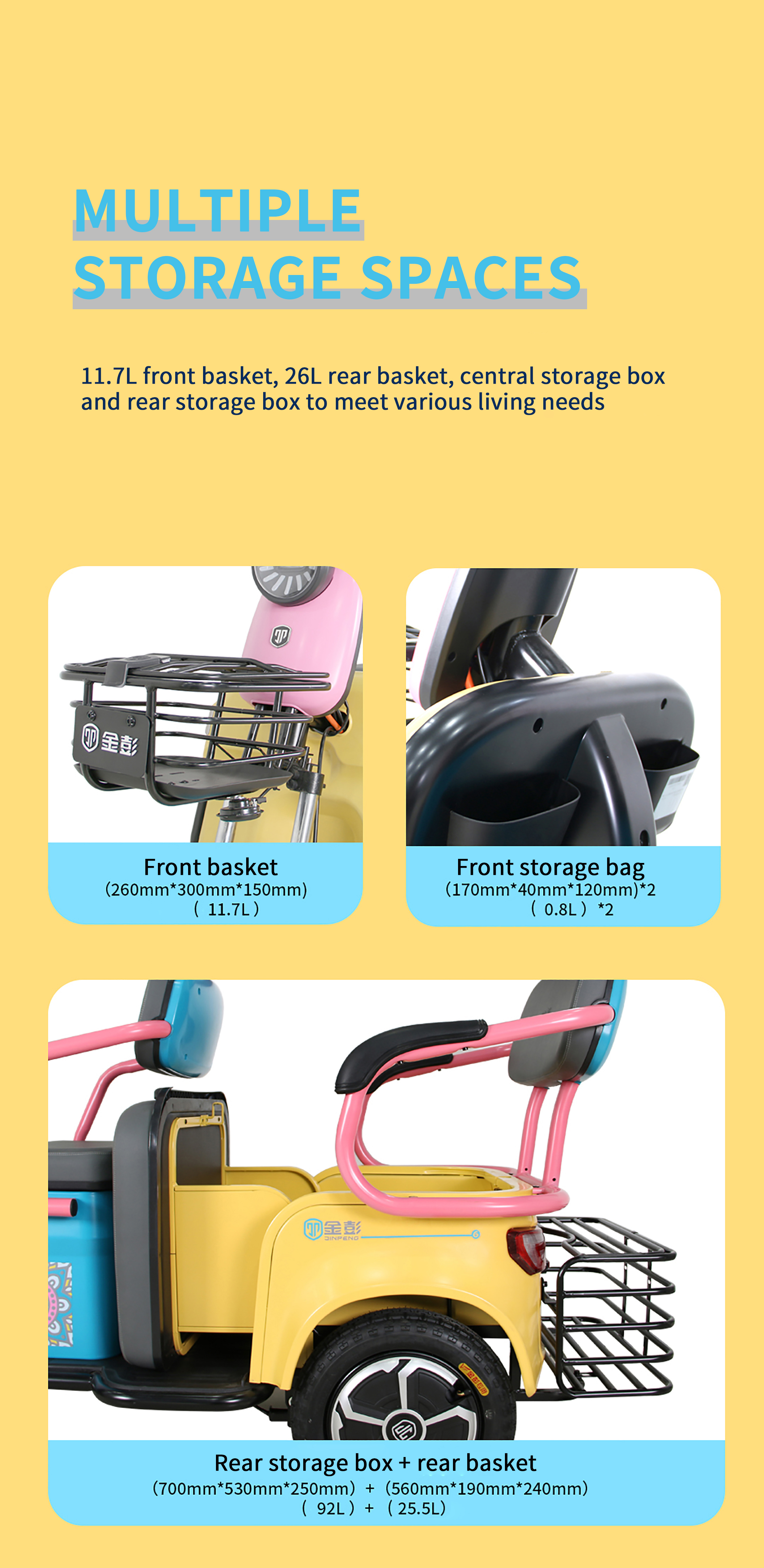 Fashionable Appearance : The Jinpeng N10 features stylish color schemes and a sleek design. making it stand out among other tricycles and becoming a bright sight on the streets.