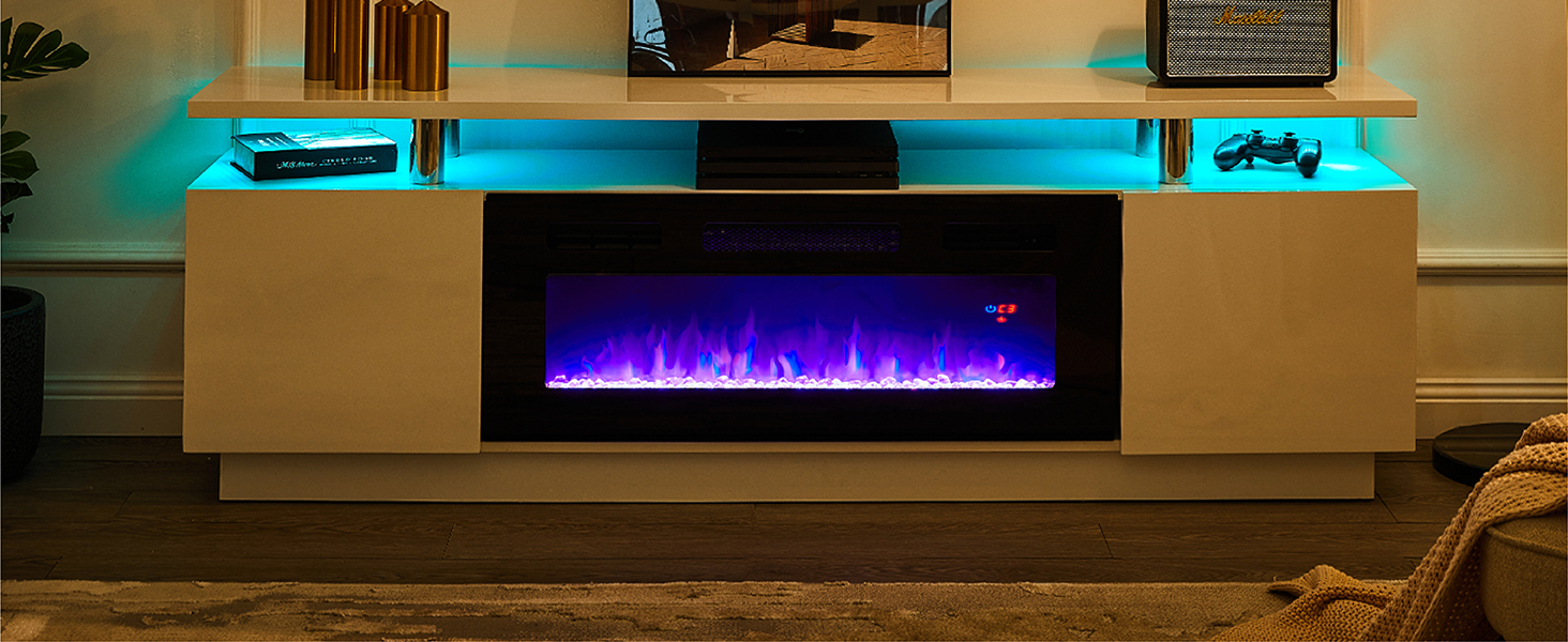 DetailBrand:AMERLIFEPower Source:Corded ElectricProduct Dimensions:14.4"D x 70.2"W x 22.6"HMaterial:Engineered WoodFinish Type:High Gloss & Matte whiteInstallation Type:FreestandingHeat Output:5100 British Thermal UnitsSpecial Feature:70" Modern High Gloss, Adjustable Flame&LED, Temperature Control & Time Setting, 36" Electric Fireplace, 2 Tier DesignStyle:ModernColor:White & Black