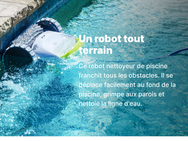 - An all-terrain robot: This pool cleaner robot overcomes all obstacles. It moves easily across the bottom of the pool. climbs the walls and cleans the water line.