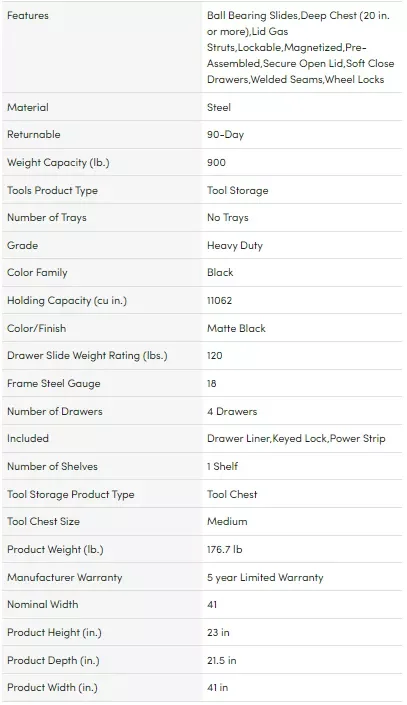 DetailIntroducing the all new Husky Industrial 41 in. W x 21.5 in. D 4-Drawer Tool Chest. Part of Husky's Professional Duty lineup, this chest has a heavy-duty 18-Gauge steel frame and is built to last. Each drawer is equipped with 120 lbs. rated ball-bearing slides that feature a soft-closing mechanism. Never worry about your drawers slamming and shut and tools moving around again. All drawers also have thick, pre-cut liners embossed with Husky logos to protect your tools. Inside the top hutch is an integrated power strip with USB ports and a magnetic back wall to place items for quick access. There is also a magnetic LED light strip that can be used to illuminate the interior of the hutch. Finally, combine this chest with the coordinating rolling cabinet (Model H41TR11HD, sold separately) for even more tool storage.